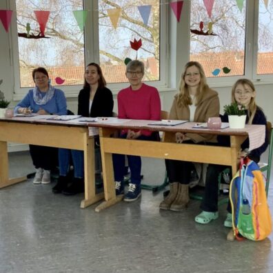 Die Pausenhalle war nett geschmückt. Es gab Kaffee und Kuchen. Für die Vorleser und Vorleserinnen war ein Bastel- und ein Spieletisch aufgebaut, um die Wartezeit zu überbrücken.